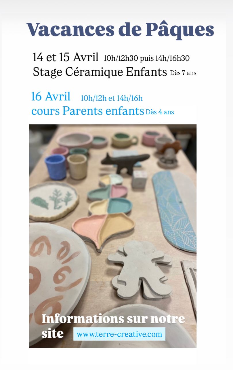 Les lundis, mardis et mercredis de chaque première semaine de vacances scolaires, venez découvrir et vous initier à plusieurs techniques : pétrir, façonner, de l’étiré au colombinage, travailler l’argile avec le plus grand plaisir !