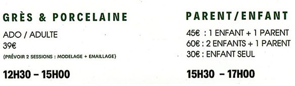 - À l’issue du stage, les créations de l’activité seront cuites par les animatrices et à récupérer un à deux mois après le stage.